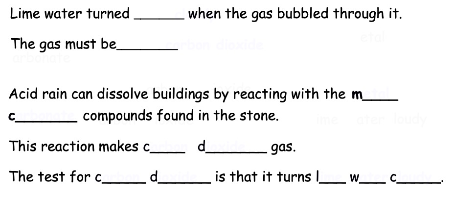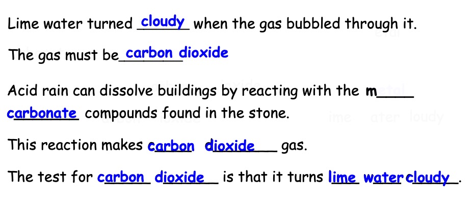 - To find out what happens when acid rain reacts with metal carbonates in building stones.