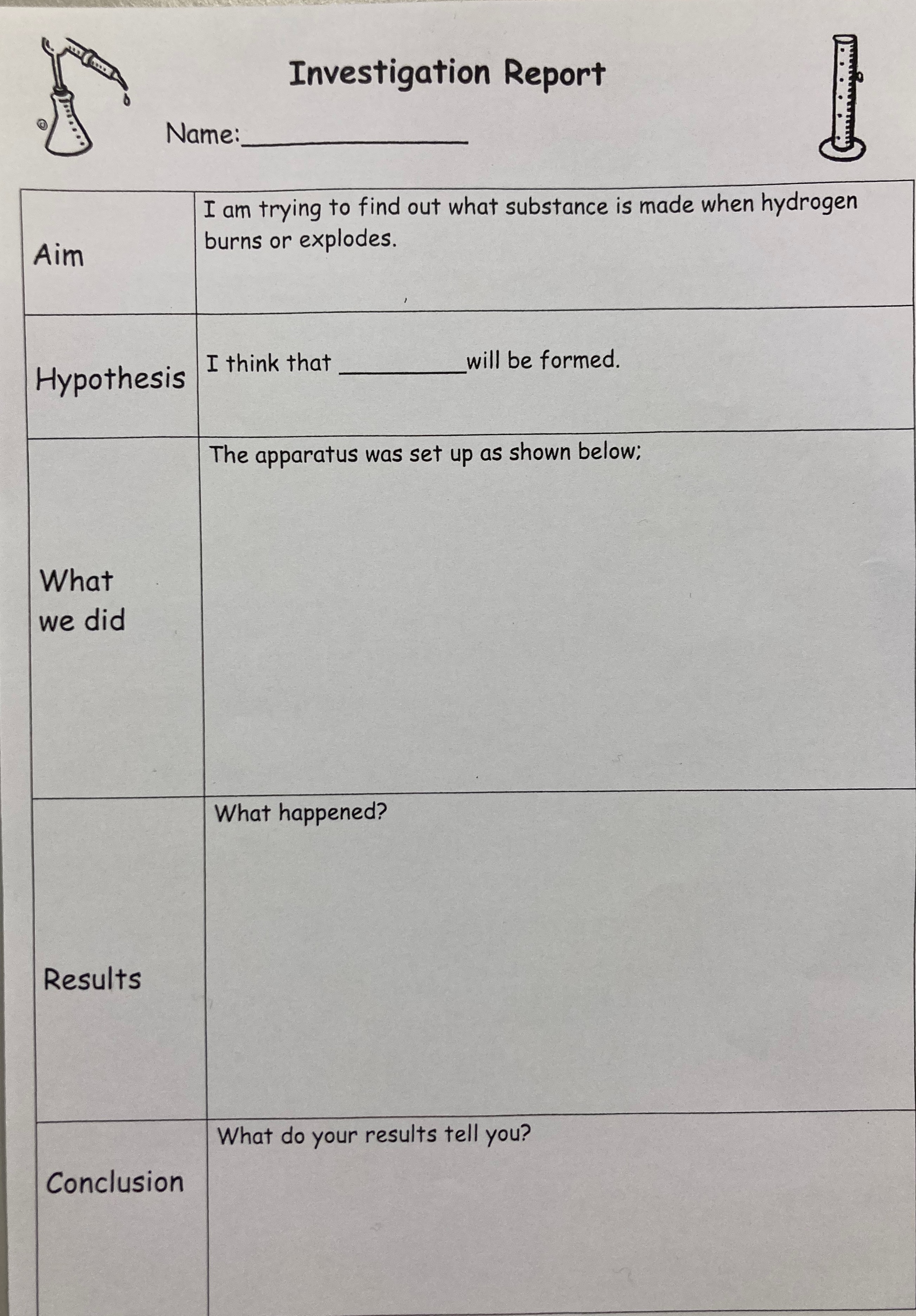 Write down what you think (hypothesize) will happen when hydrogen is burnt and why.