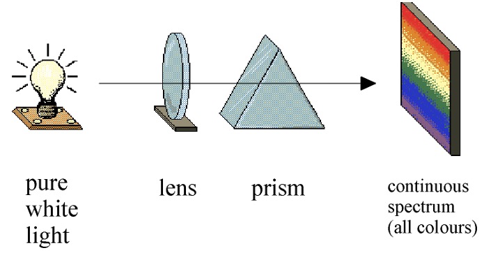 When a beam of pure white light is passed through a prism a continuous spectrum is seen (all the colours of the rainbow).