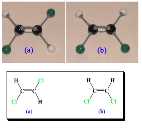 In the diagram above, molecule (a) is known as 'trans-1-2-dichlormethane' and molecule (b) is known as 'cis-1-2-dichlormethane'.