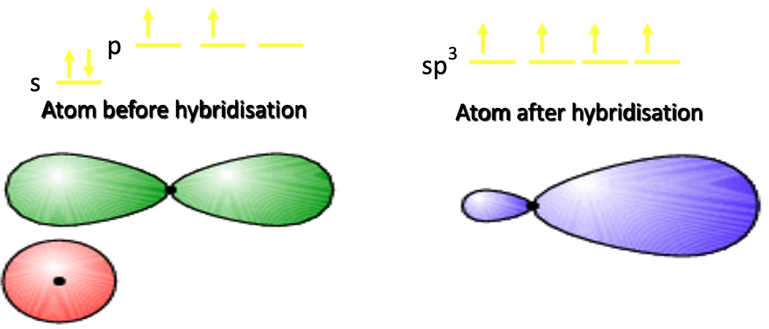 This produces 4 Hybrid orbitals of equal energy containing single electrons. This is known as sp3 hybridisation.