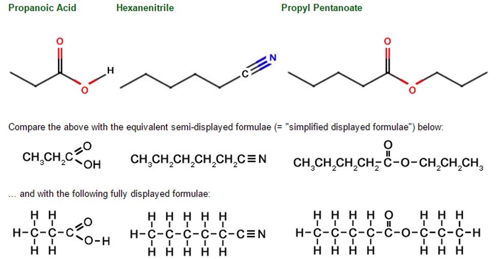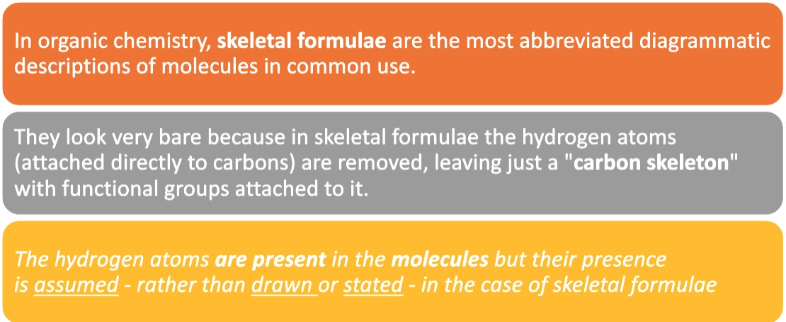 Notice that it is not necessary to write the symbols "C" or "H" for atoms that form part of simple linear chains, as opposed to other structures such as functional groups attached to alkane-chains.