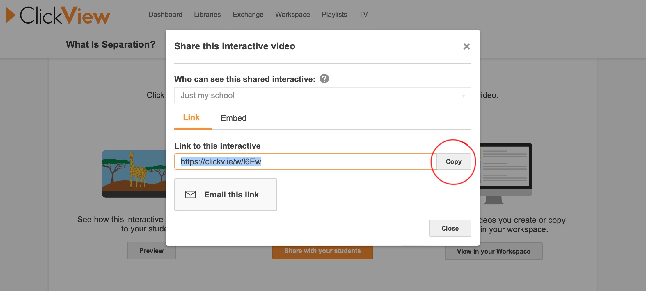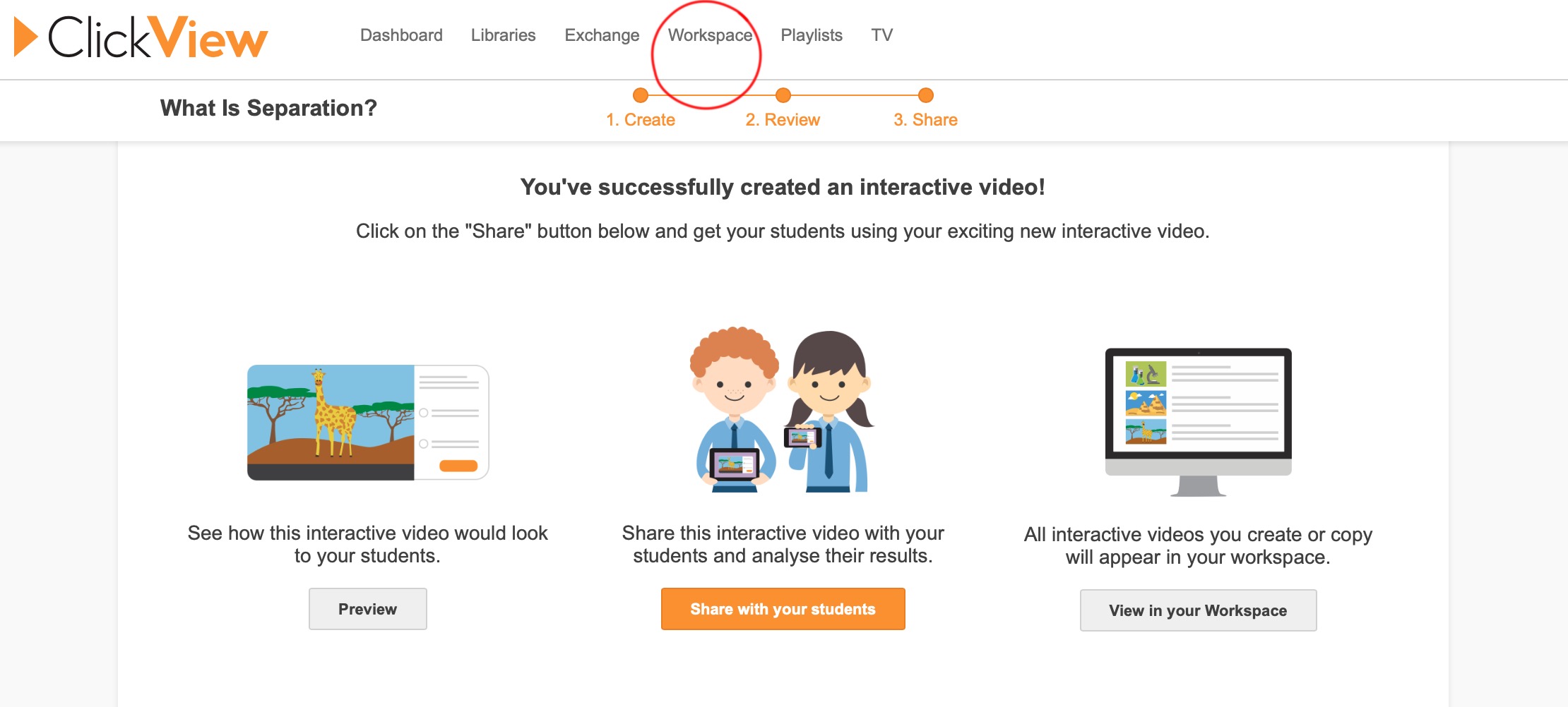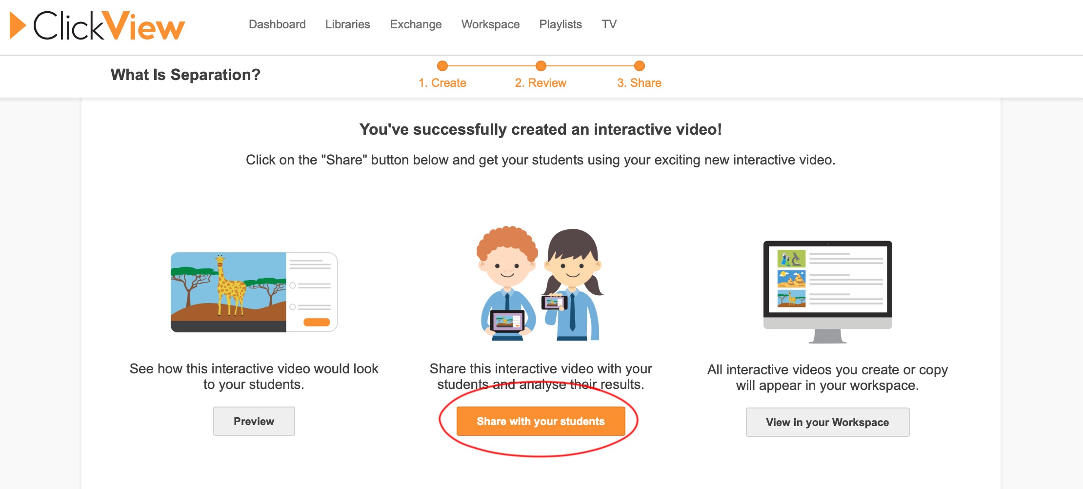 You now have three options. You can preview your video, share with your students or view in your workspace. As you can see below, I clicked share with students here.