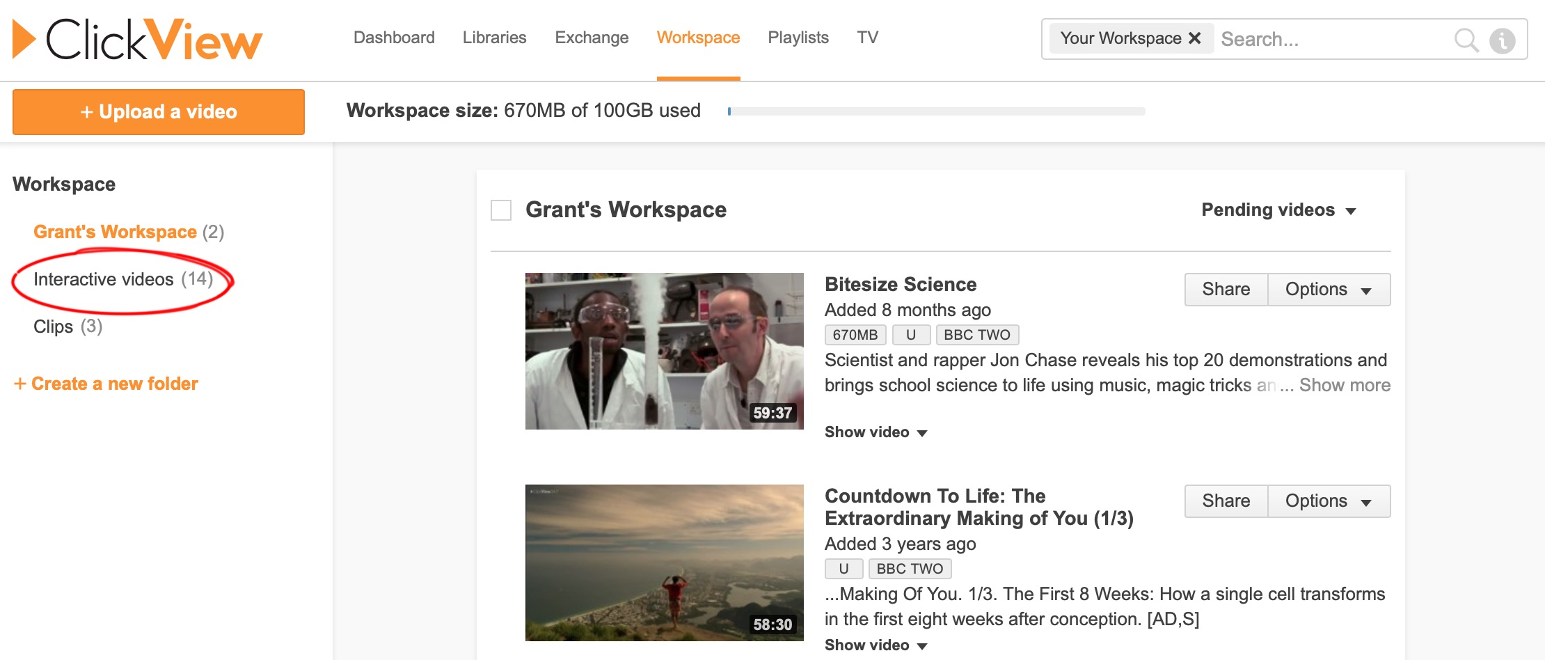Then click 'Interactive Videos' under the Workspace heading, as shown below.