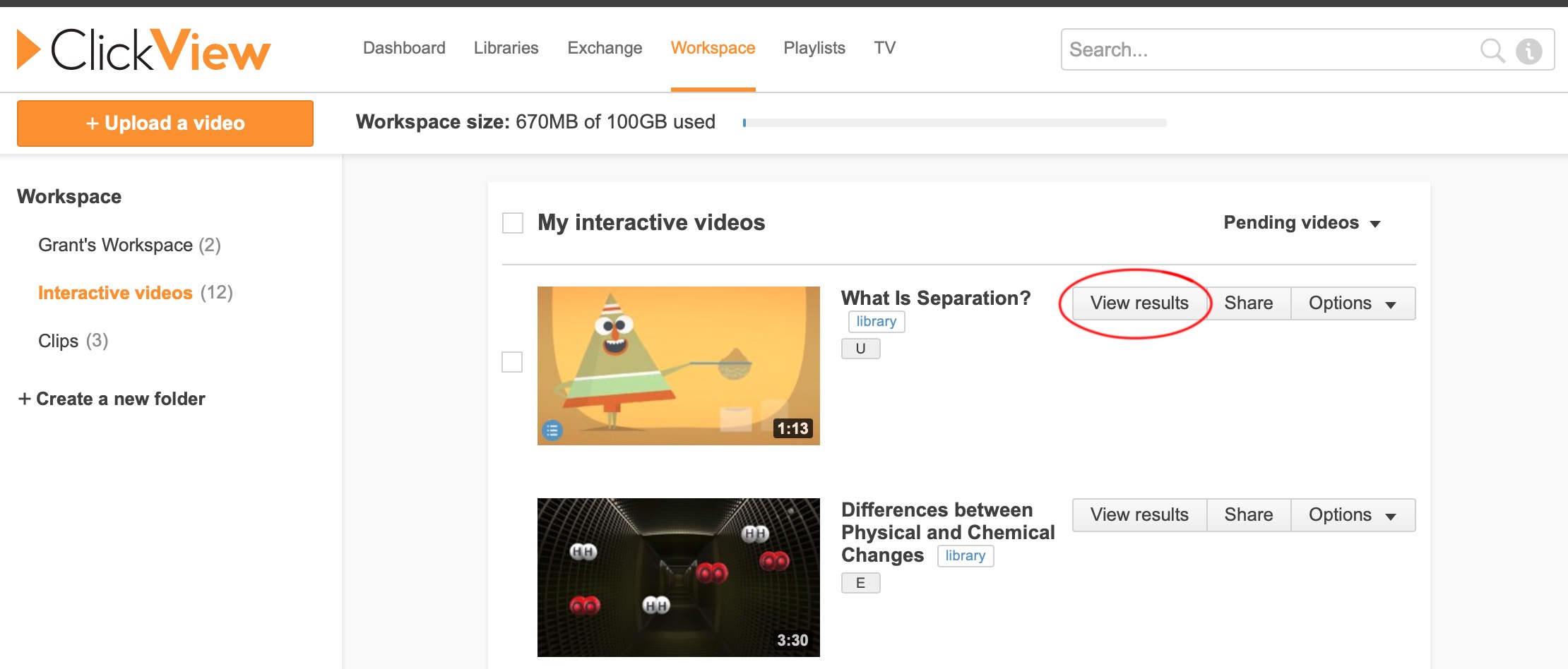 Once your students have viewed your interactive video, to view their results first click 'workspace', as shown below.