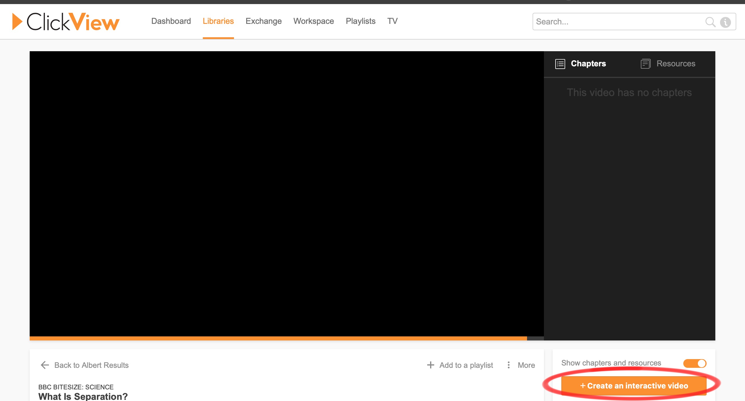 Once you have selected a video that you would like to use, click on create interactive video. This is circled in the picture below. This will add your video to your workspace.