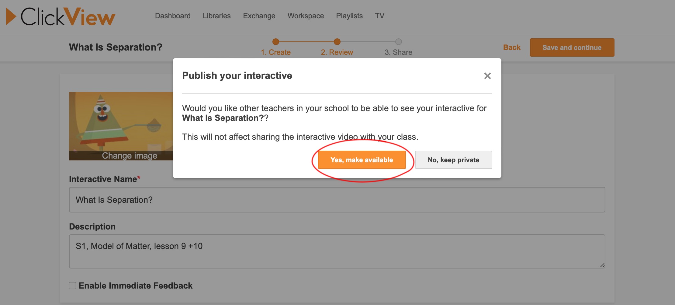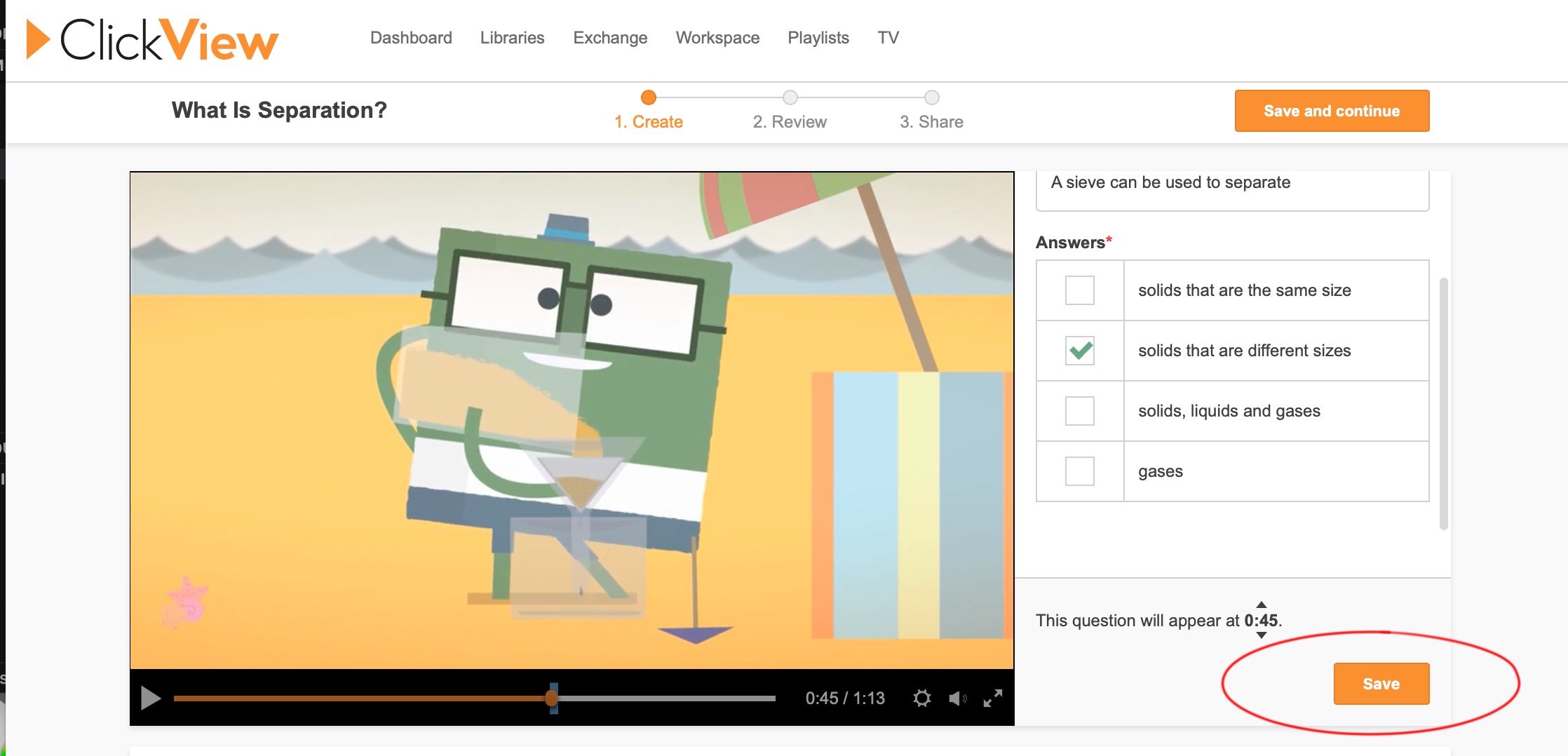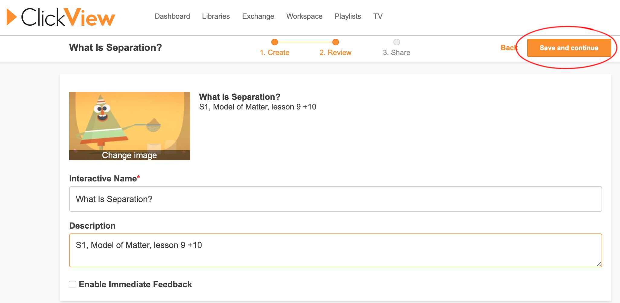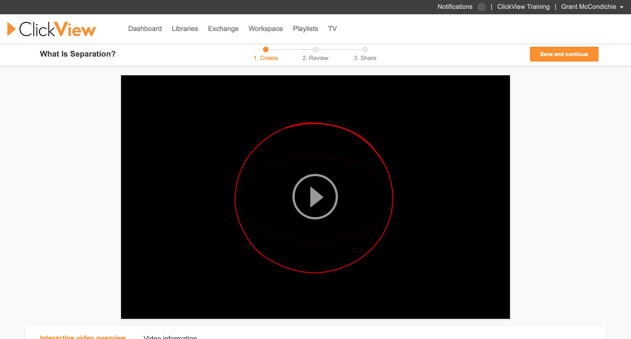 Your questions will appear under the 'interactive video overview' header, as highlighted below. Once you have finished creating hit 'save and continue', highlighted below.