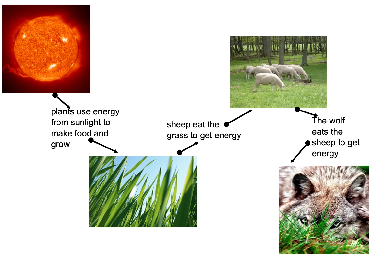 Animals cannot make their own food and so need to eat plants or other animals to get energy.