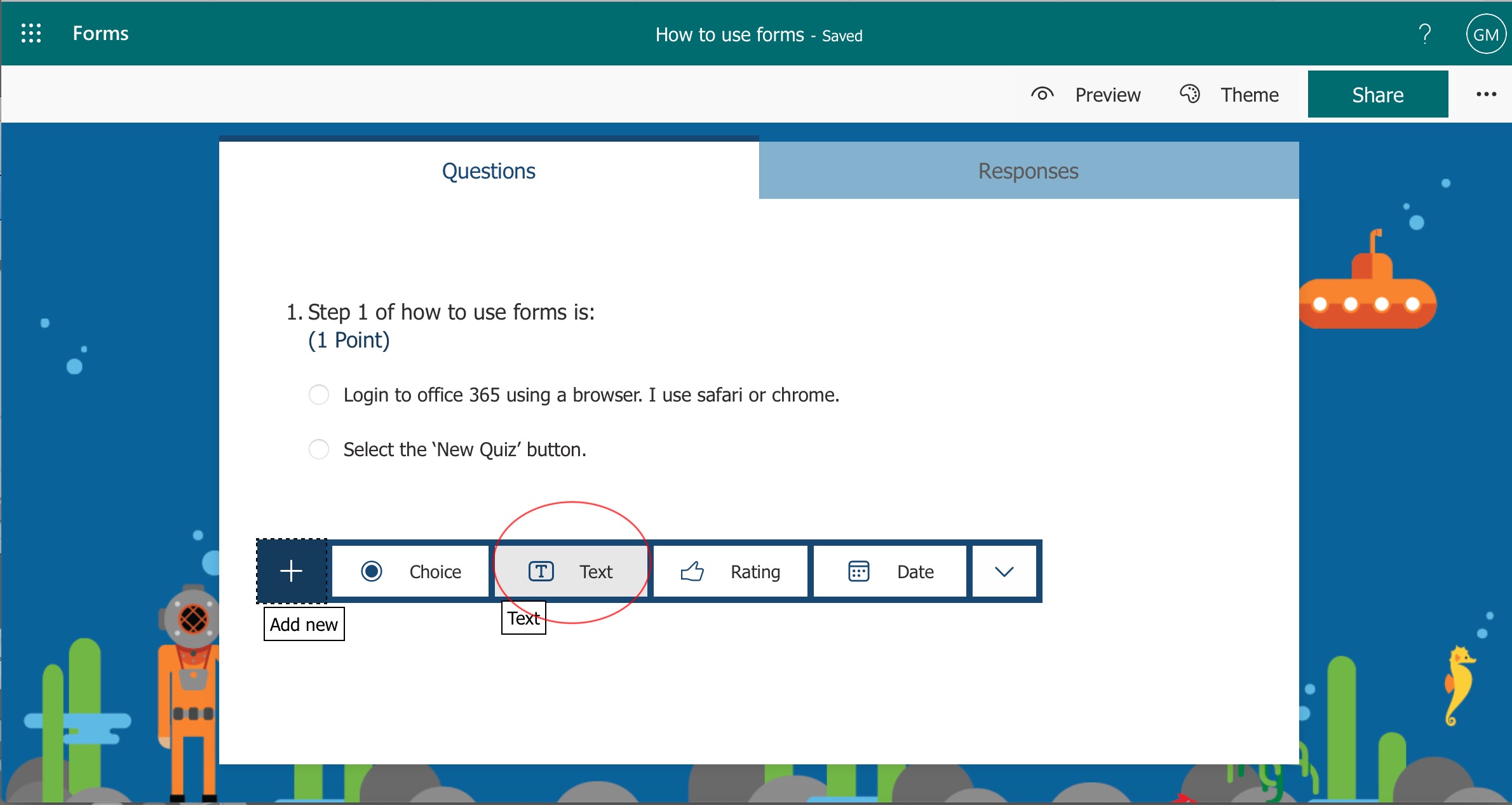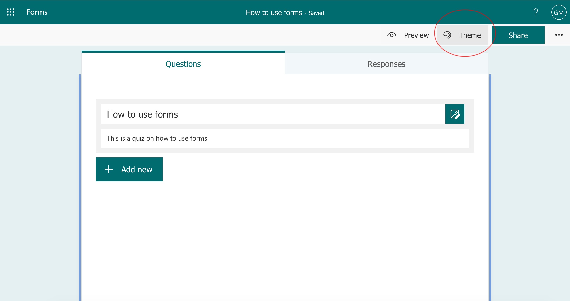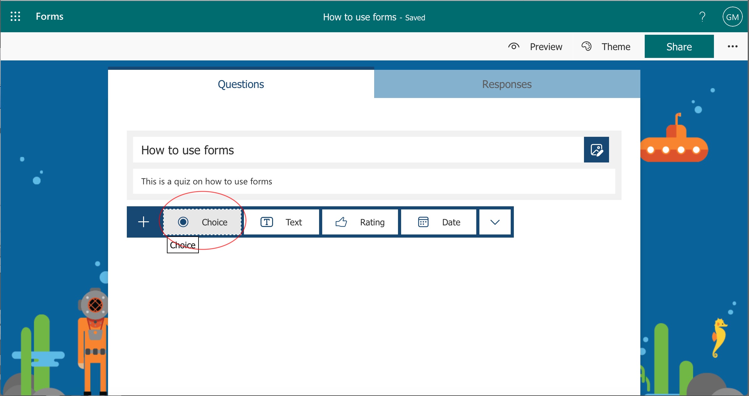 Click on 'Theme' to give your quiz a theme.