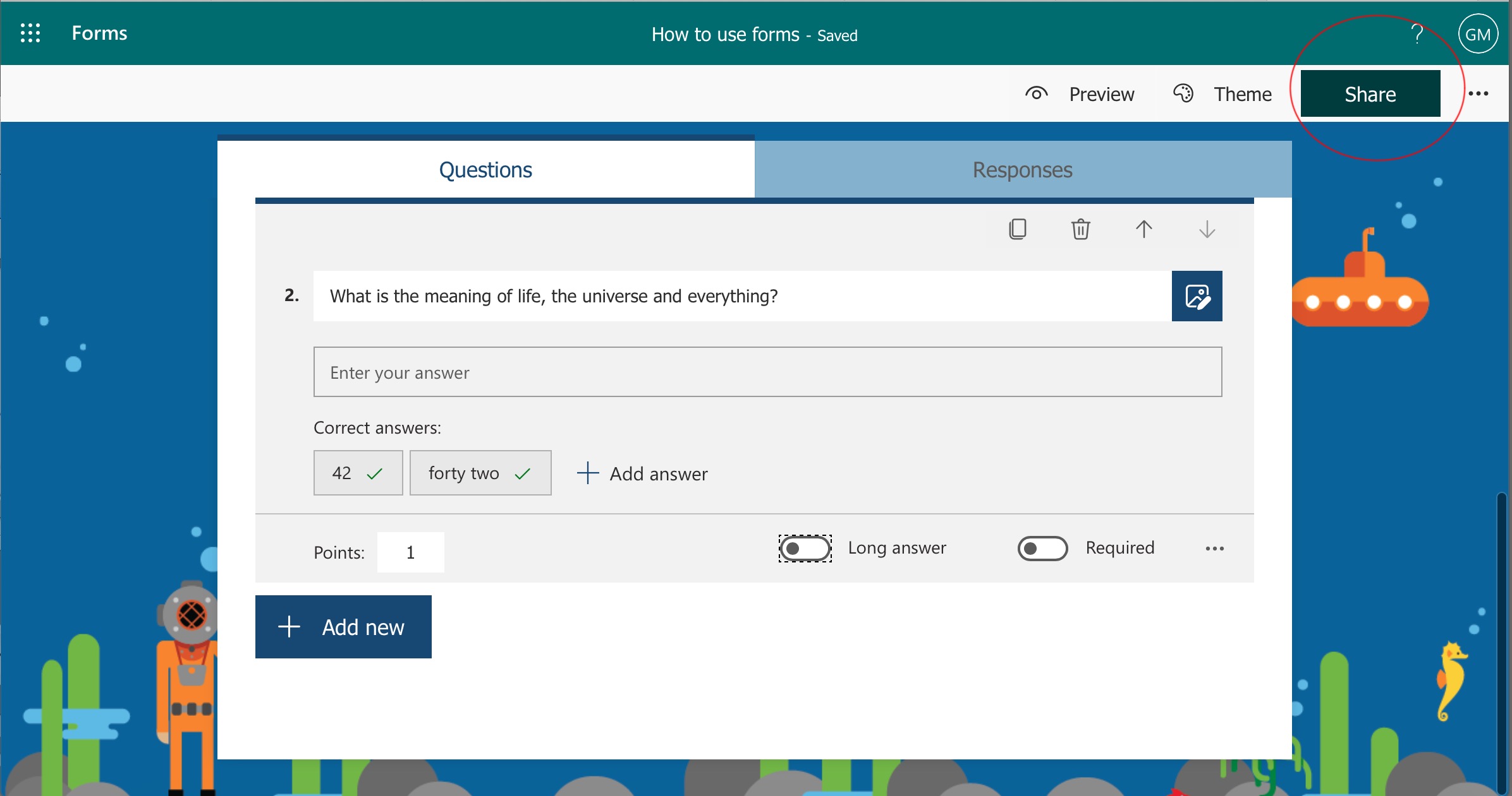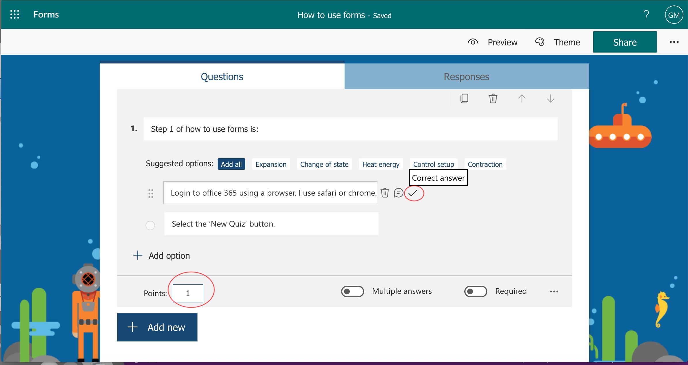 Add a question and answers. Remember to select the correct answer and give your question some points.