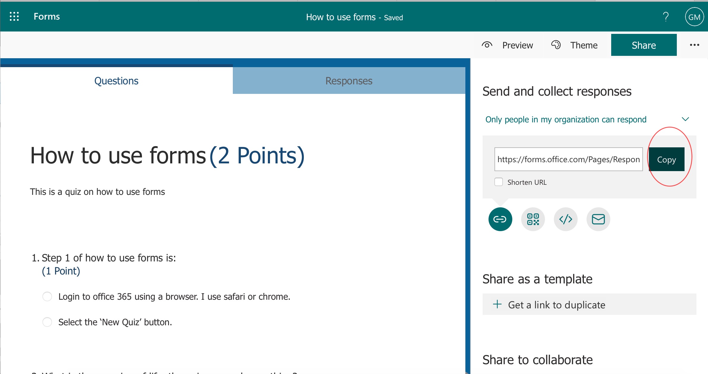 Then select copy to copy the link to your form.