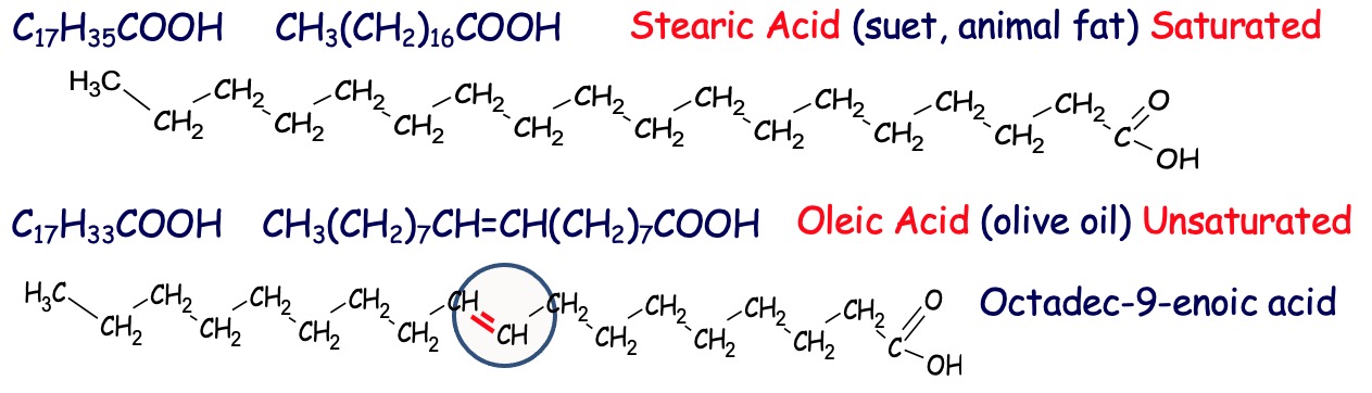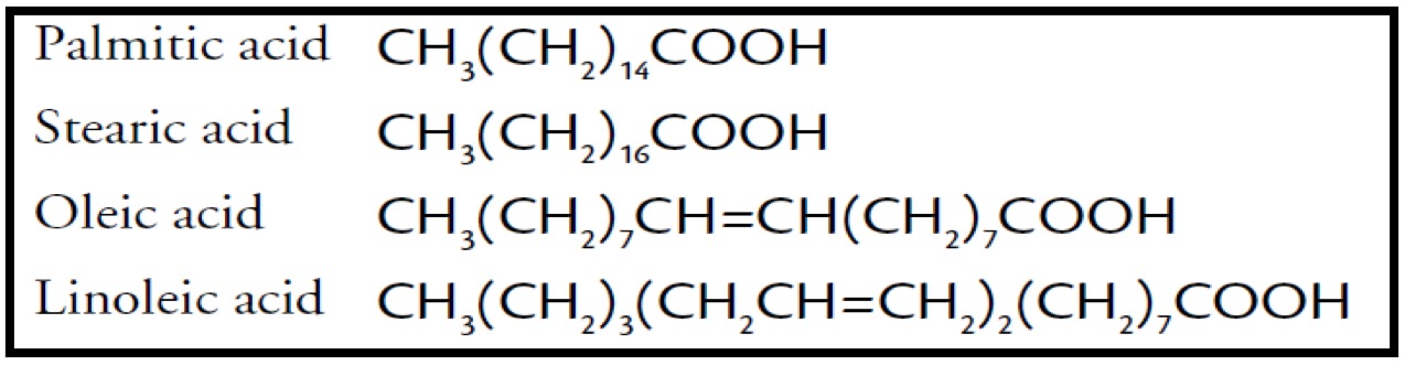 Fatty acids are saturated or unsaturated straight chain carboxylic acids with even numbers of C atoms ranging from C4 to C24, but mainly C16 to C18.