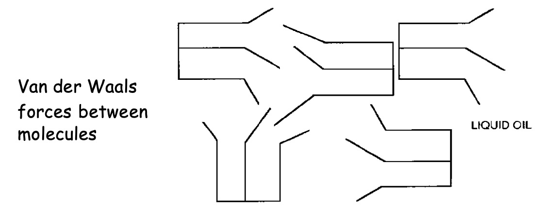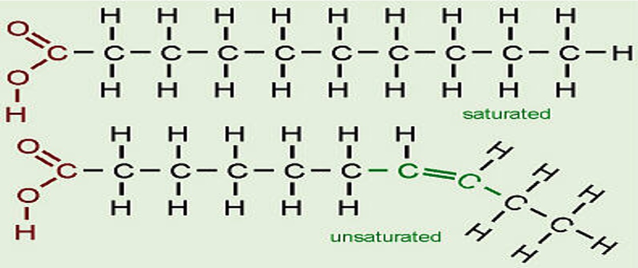 If a double bond is present then the oil (and some fats) molecules zigzag and the molecule chains become distorted and cannot fit into one another.