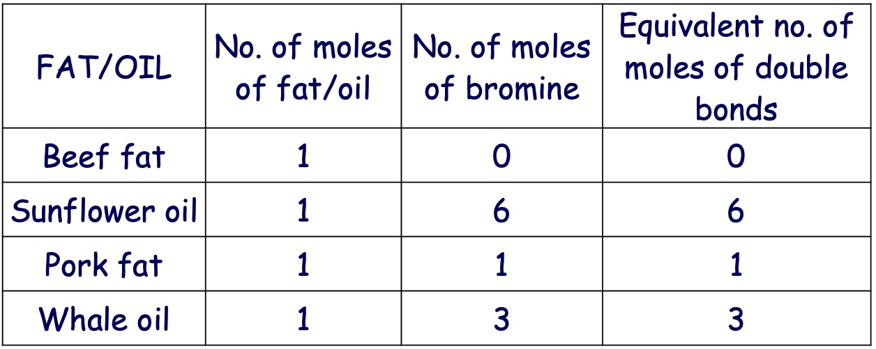 If a fat is dissolved in an organic solvent such as hexane and then shaken with bromine water, no decolourisation occurs with some fats and only slight or slow decolourisation with others.