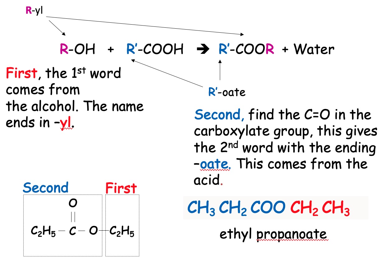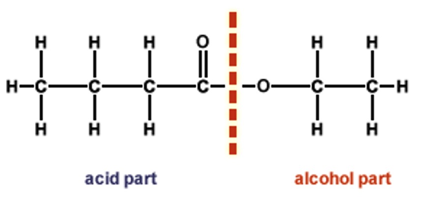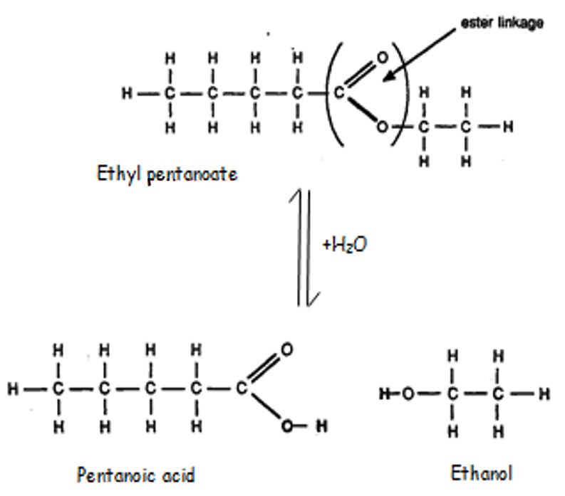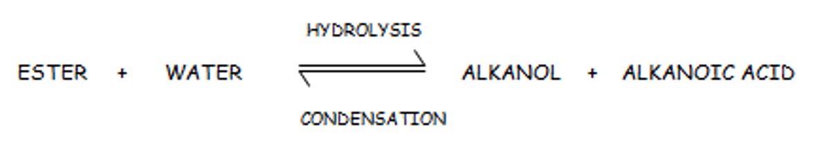 Note: during the hydrolysis water breaks down the ester by breaking the ester linkage. The -OH adds back on to the acid and the H adds back on to the alkanol.