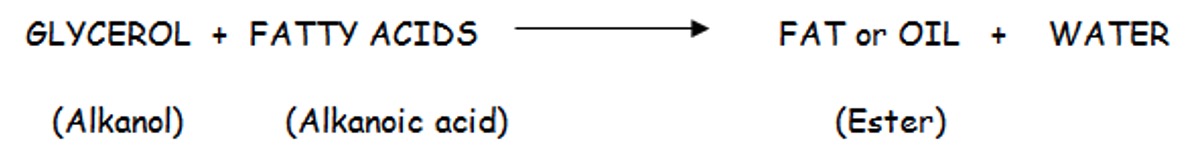 Edible fats and edible oils are naturally occurring esters of the alcohol, glycerol and long chain alkanoic acids.