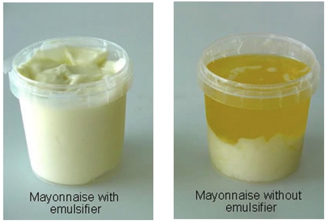 Mayonnaise contains oil and water. The emulsifier keeps these mixed and without it the oil and water separate.