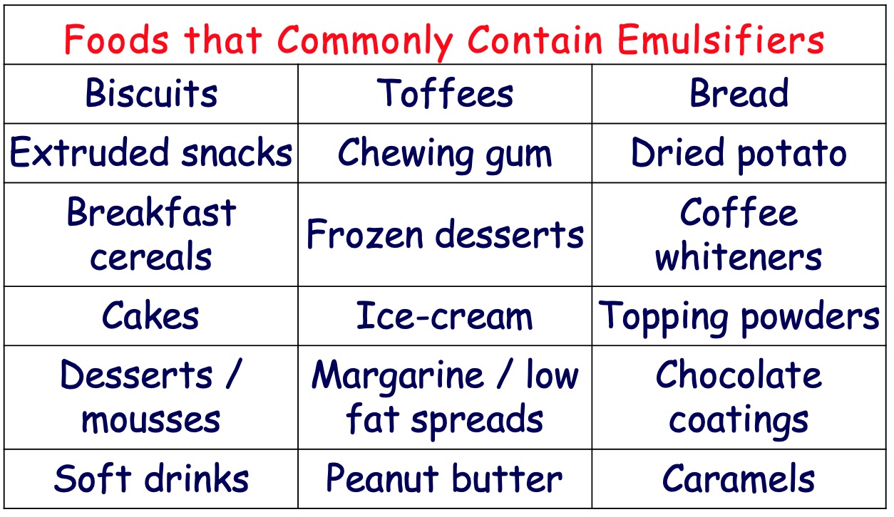 Emulsions in food are mixtures of oil and water. To prevent oil and water components separating into layers, a soap-like molecule known as an emulsifier is added.