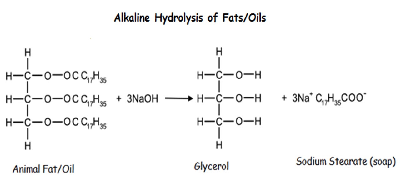 Soaps are formed by the alkaline hydrolysis of fats and oils by sodium or potassium hydroxide by boiling under reflux conditions.