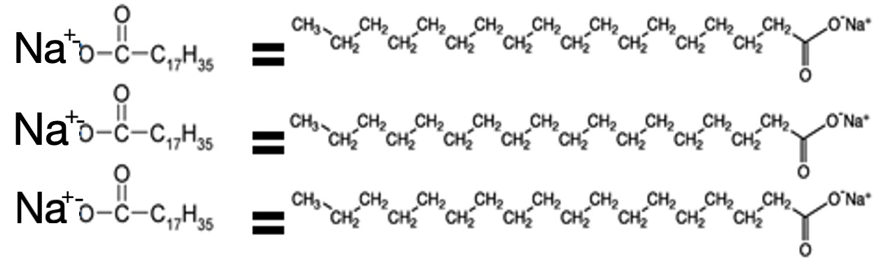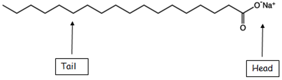 In solution a soap molecule consists of a long non-polar hydrocarbon tail (C17H35-) and a polar head (-COO-).