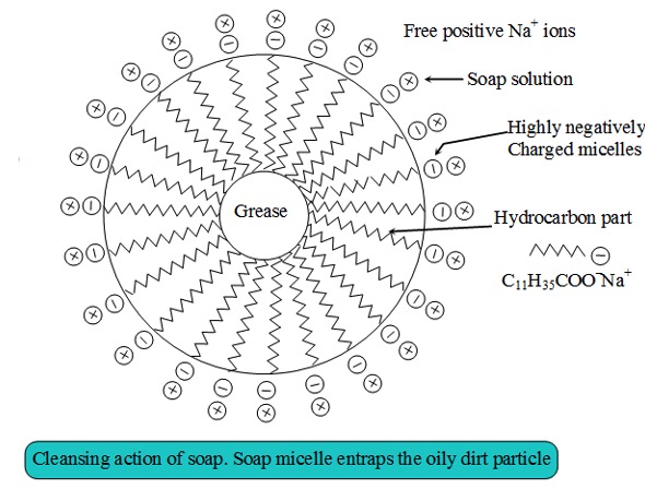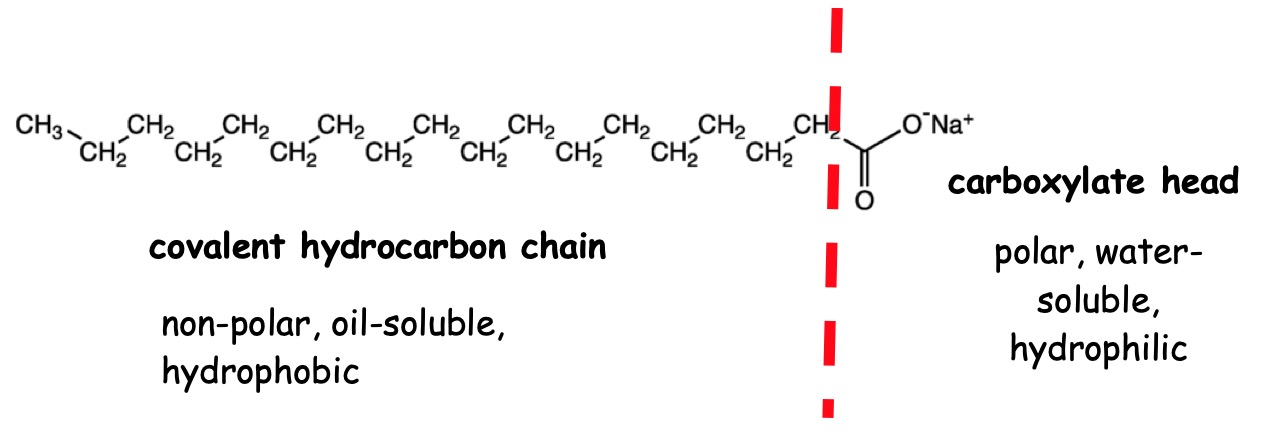 The long covalent hydrocarbon chain gives rise to the hydrophobic (water hating) and oil-soluble (non-polar) properties of the soap molecule.
