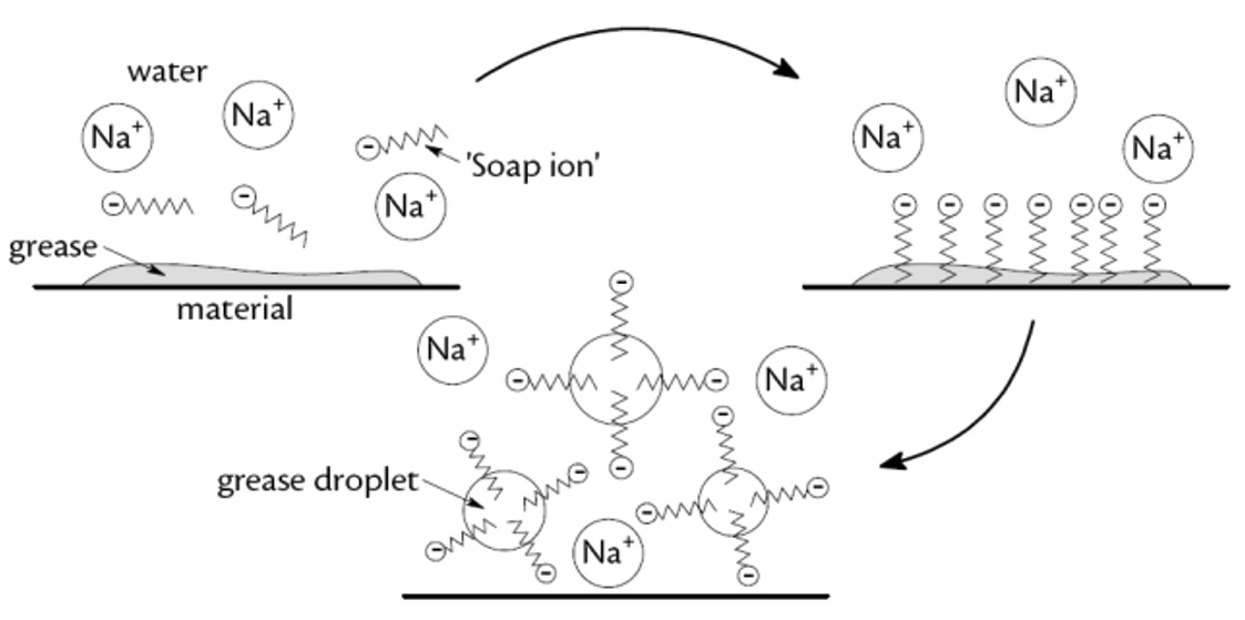 This represents the initial interaction of soap on addition to water and material with a grease stain. This repulsion prevents the oil droplets re-joining and helps disperse the oil.