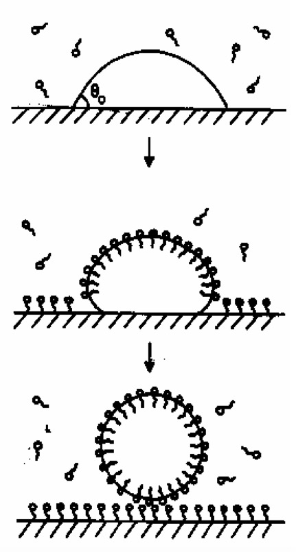 The hydrophobic tails 'burrow' into the droplet of oil or grease. The hydrophilic heads are left to face the surrounding water.