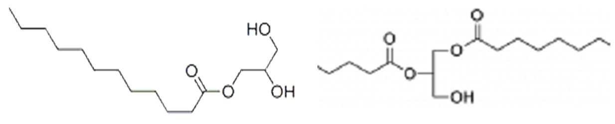 The one or two hydroxyl groups present in these molecules are hydrophilic whilst the fatty acid chains are hydrophobic.