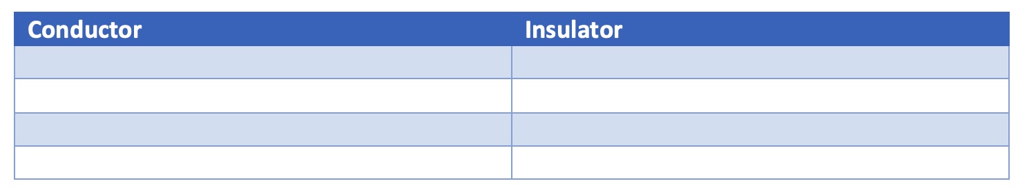 Identify conductors and insulators from a list of common materials.